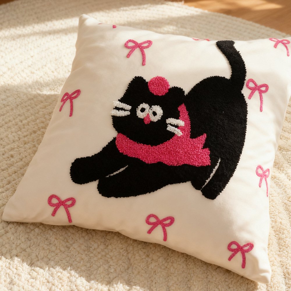 Họa tiết mèo đen với chi tiết sợi nổi mềm mại, giúp sofa hoặc giường ngủ trở nên sinh động và đáng yêu hơn.